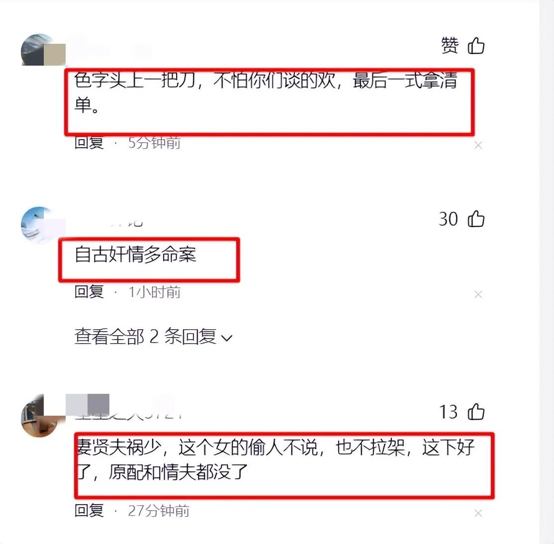 有网友说:自古奸情多命案,妻贤夫祸少,这个女的偷人不说,也不拉架,这下好了,原配和情夫都没了。