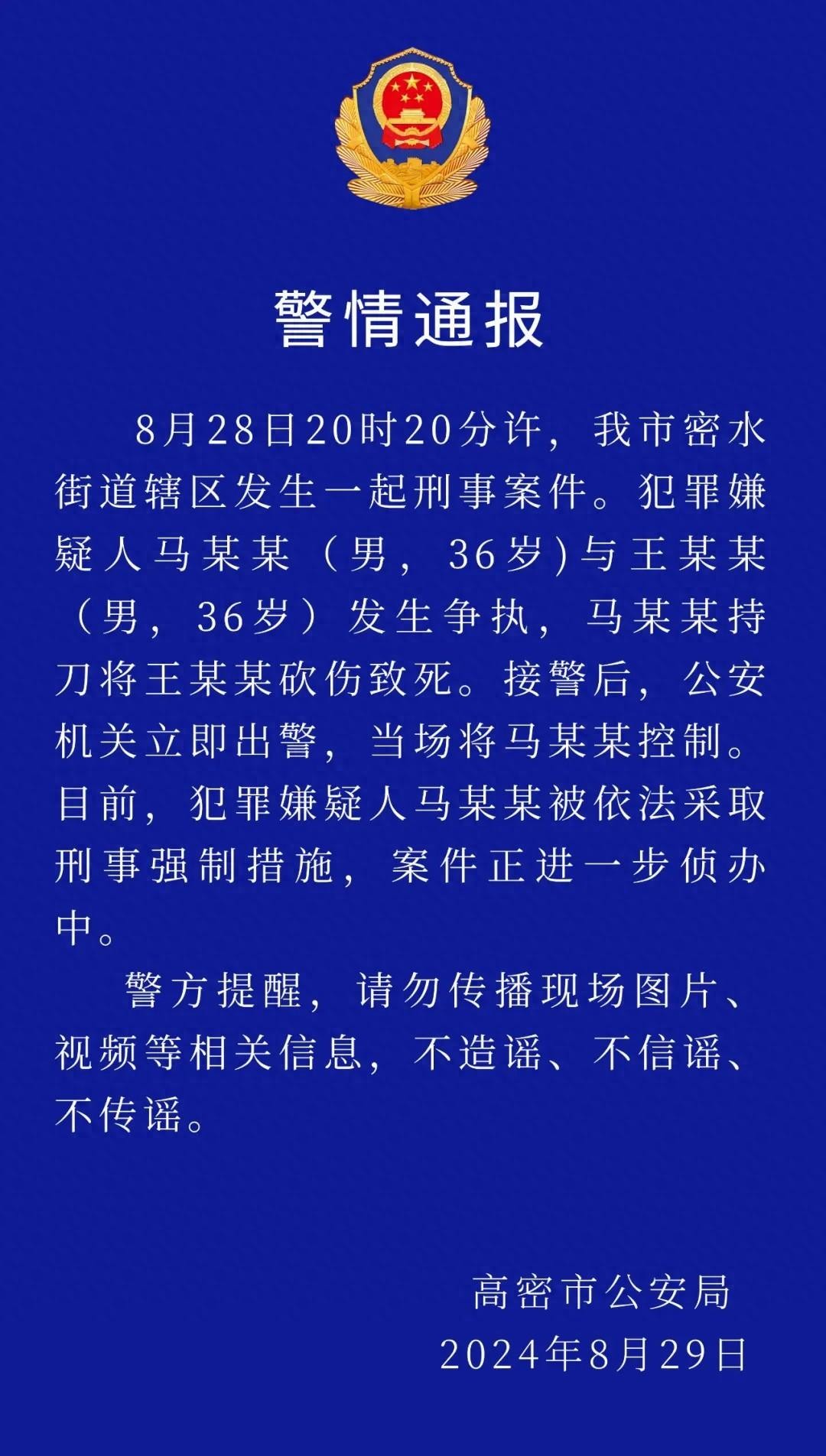 由于事件太过恶劣,并且迅速在网络发酵,高密市公安局在8月29日上午,就针对该杀人案件发布了敬请通报。