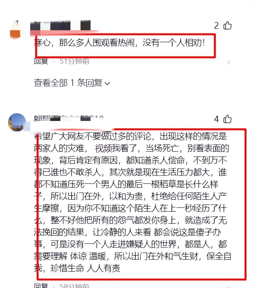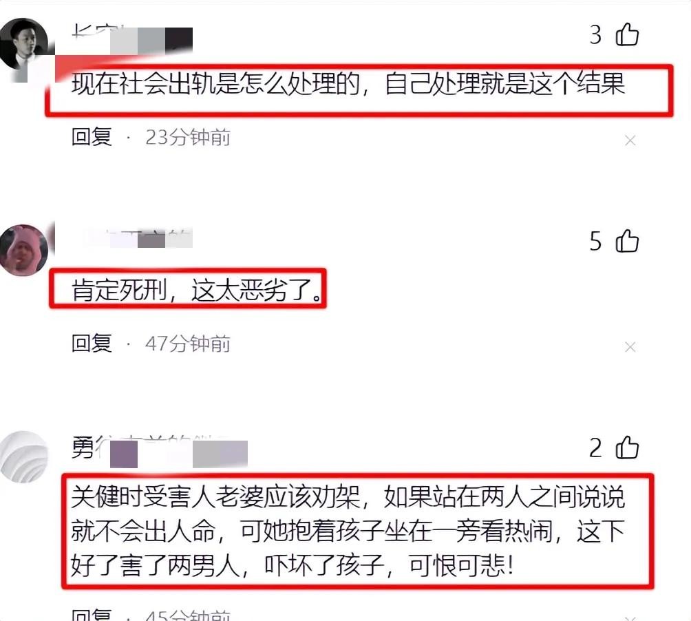 还有网友说:关键时刻,受害人的老婆理应劝架,倘若能站在两人中间劝和一番,或许就不会闹出人命。可她却抱着孩子坐在一旁瞧热闹,这下可好,害了两个男人,还吓坏了孩子,着实可恨又可悲!