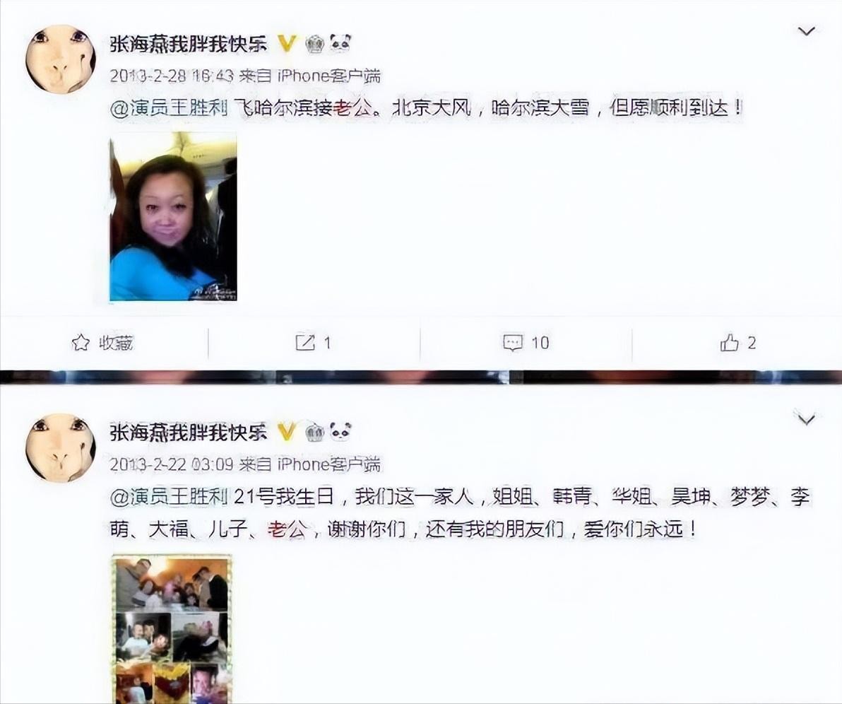 在12年的时候张海燕还会在社交平台秀恩爱,在她上飞机去找老公王胜利,她会微博祝愿平安。也会晒出老公和朋友为自己庆生的微博,可以说第二段婚姻非常顺利。