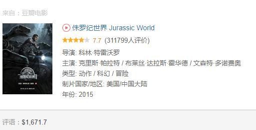 6侏罗纪世界 Jurassic World,全球票房16.71亿美元