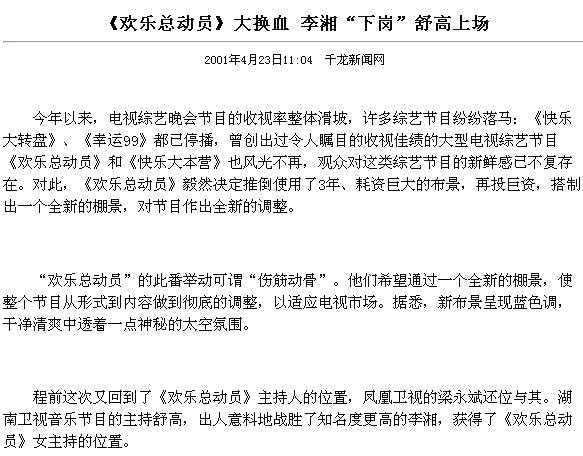 2002年,她还成为首位登上香港红馆舞台的内地主持人。如此种种,让舒高在湖南卫视的地位扶摇直上,以致于《欢乐总动员》收视下滑时,她居然能顶替李湘,接过主持棒,大有成为“芒果一姐”接班人的架势。