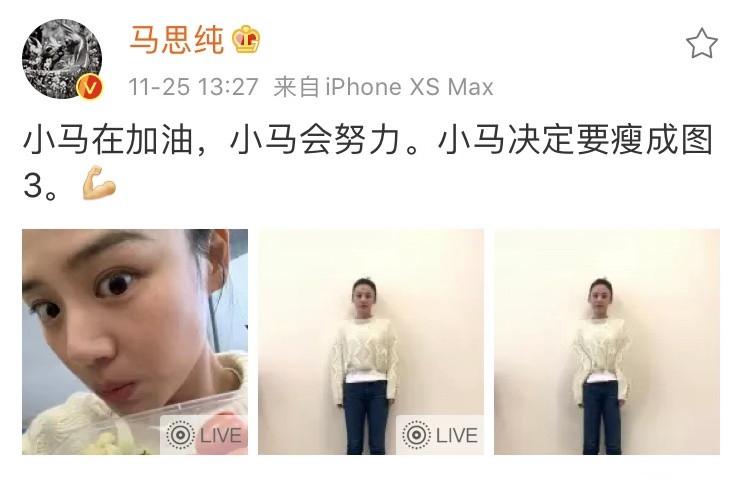 之后马思纯也回应了这件事,晒出自己吃素食的照片和一张P到变形的照片,幽默回应网友对她身材的讨论:"小马会加油,小马会努力的,小马决定要瘦成图3。"