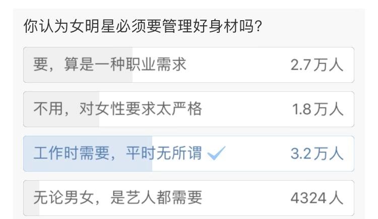 女演员应该为了角色做好身材管理吗?网上有这样一则投票,有3.2万人选择了"工作时需要,平时无所谓",所以大多数网友还是比较理智的。
