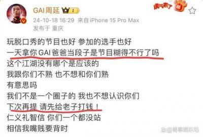 GAI在发文中表示:“玩脱口秀的节目也好,参加的选手也好。一天拿我当段子是节目糊得不行了吗?这个江湖没有哪个是应该的,我跟你们不熟,也不想和你们熟,有意思吗?”言辞之间,不仅流露出他对这种调侃形式的不满,更显露出他对自身形象、外貌特征被取笑的反感。