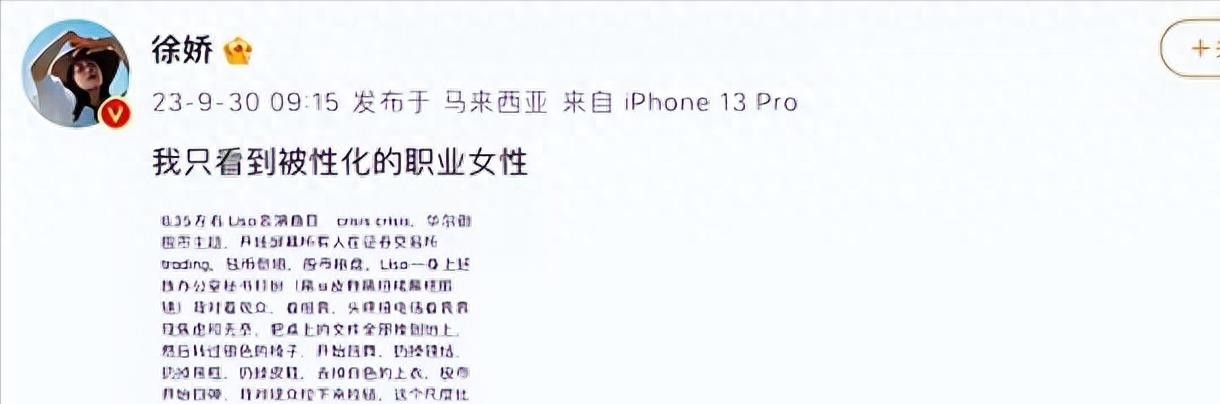 照片中的徐娇只是穿了一身蓝色比基尼。一些人认为这是一种过于暴露的穿着,对女性形象的贬低。但是,徐娇并没有受到这些负面评论的影响,