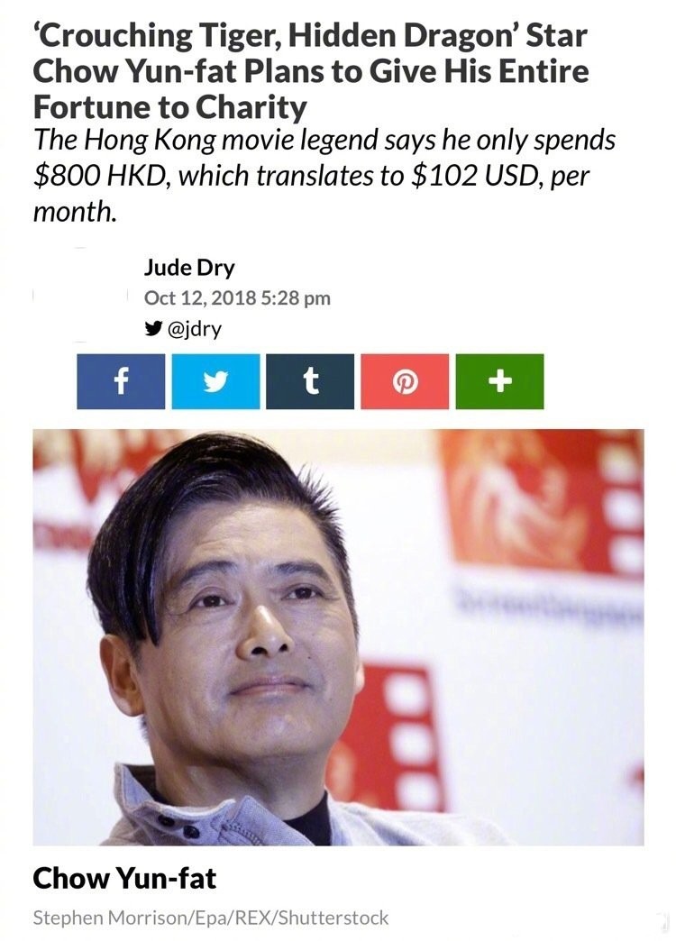 但这并不是漂亮话,在娱乐圈打拼40多年的周润发在接受采访时宣布自己计划将56亿港币(现在汇率换算约46亿人民币)捐给慈善机构,并表示“钱不是我的,我只是暂时保管它”。此前也有媒体报道周润发平时生活十分节约,一个月只花费800港币(约660人民币)。