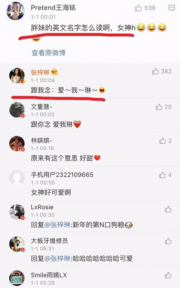他们夫妻二人在娱乐圈中虽然比较低调,但给孩子取名字的时候真真是秀了一把恩爱。在2016年末的时候,张梓琳晒出了女儿的照片并公开了名字:Evelyn。好奇的网友在送上新年祝福的同时也问起孩子英文名字的读音,张梓琳回复说是爱~我~琳的音译。这个答复一出来,网友直呼好甜啊,一致猜测这个名字一定是张梓琳老公取的,真的是新年的第一口狗粮。