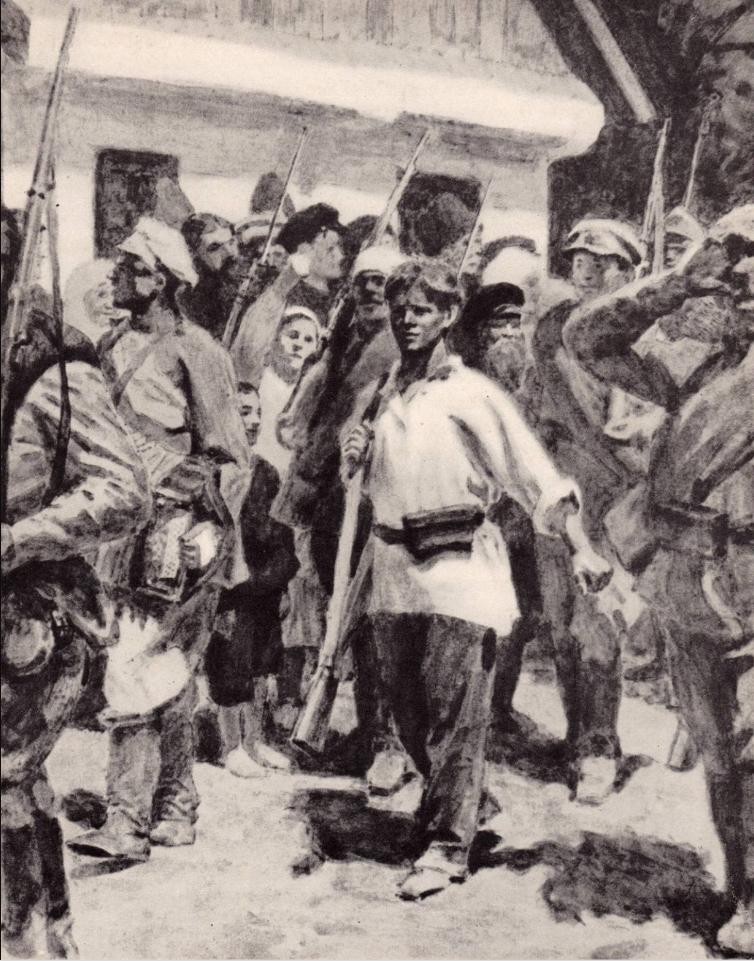 4、谢廖沙参军:列兹尼琴科版本里没有谢廖沙出现的场景,这一幅画,算是弥补了我们熟知版本里的小说插图的缺憾。