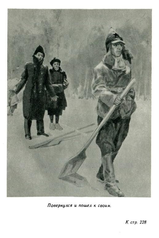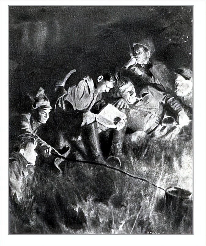5、保尔在部队里读小说:这个场面气氛渲染的比较好,人物之间比较协调自然,应该是画家这套插图里值得称道的一幅作品。
