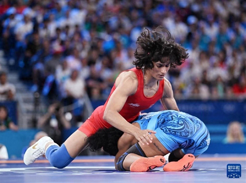 8月6日,印度选手弗加特(左)与古巴选手古兹曼·洛佩斯在比赛中。图源新华社