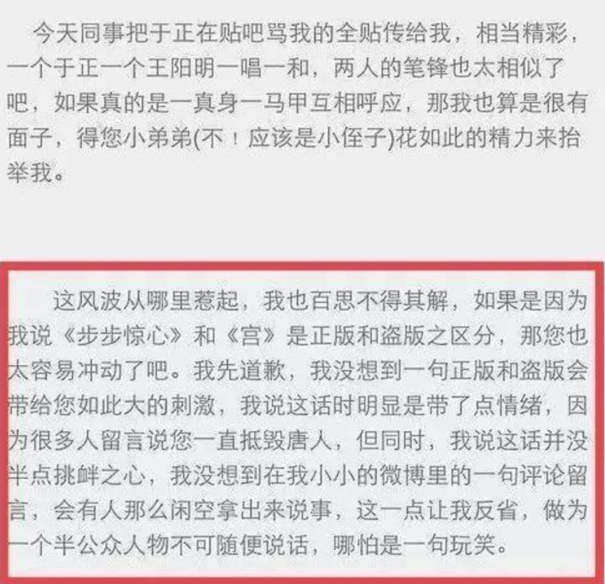 为此,蔡艺侬还发了一篇著名的文章来回应于正,说《步步惊心》和《宫》,是正版和盗版的区别。