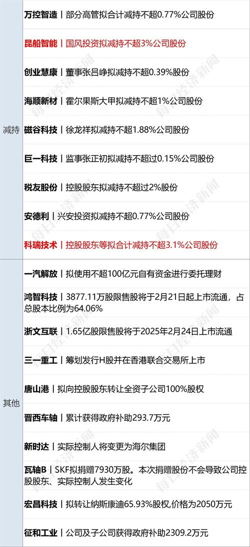 三一重工(SH600031,股价17.04元,市值1444亿元):2月18日,三一重工公告,公司正在筹划境外发行股份(H股)并在香港联合交易所有限公司上市事项,旨在推进公司的全球化战略,加强与境外资本市场的对接,并提升公司治理透明度和规范化水平。