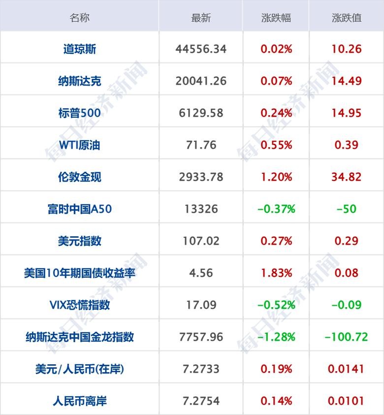 美股三大指数均小幅收涨,道指涨0.02%,纳指涨0.07%,标普500指数涨0.24%,创历史新高;Meta跌超2%,结束20连涨;奈飞跌超2%,亚马逊、谷歌、苹果、特斯拉小幅下跌;英特尔涨超16%,2月以来累涨超40%,创去年8月份以来新高;微软、英伟达小幅上涨。中概股涨跌不一,纳斯达克中国金龙指数收跌1.28%;爱奇艺跌超9%,百度跌逾7%,京东跌近6%,哔哩哔哩跌逾5%,向上融科跌超3%;文远知行涨超28%,小鹏汽车涨近5%,拼多多涨逾3%,阿里巴巴涨近2%。