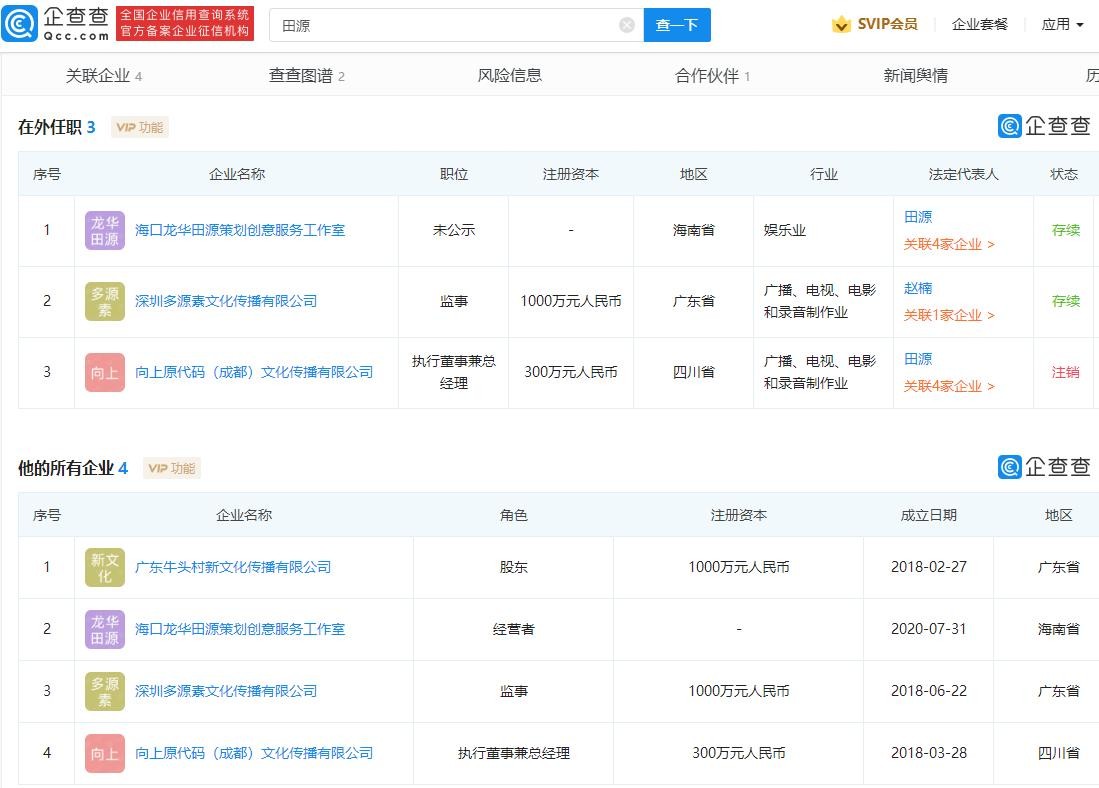 企查查APP显示,田源目前共关联包括广东牛头村新文化传播有限公司在内的四家公司,向上原代码(成都)文化传播有限公司已于2019年4月注销;此外,深圳多源素文化传播有限公司法定代表人为田源妻子赵楠,田源于该公司无持股,任监事职务。