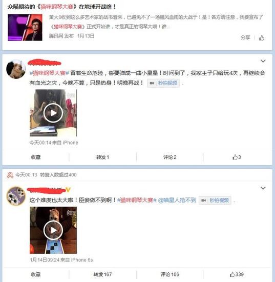 当模仿者日益增加时,“抢不到”在微博宣布举办第一届“猫咪钢琴大赛”并创建了相关话题,由此,活动不仅引来了数万用户的围观,上传和猫咪玩游戏的人也越来越多。