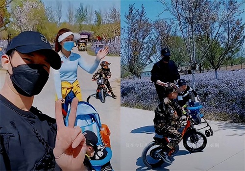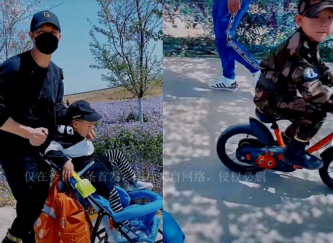 视频中,谢孟伟带着两个儿子一同出门,小一点的坐在儿童车上,而大一点的则骑着自行车。两兄弟的长相都继承了父母的优良基因,可爱而颜值高。他们一家人彼此之间的互动充满了快乐和爱意,展现出了幸福家庭的画面。