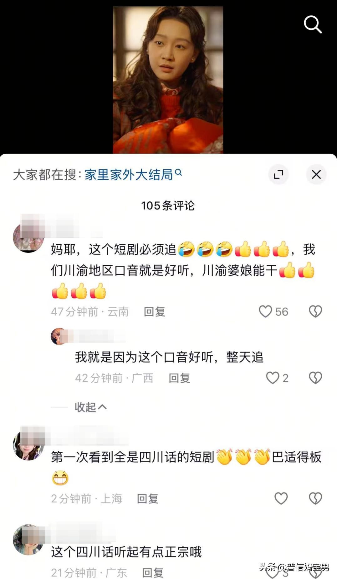 在短兵相接的短剧市场,听花岛投入300万元打造《家里家外》,主打温情路线,率先开辟短剧新赛道:这是全网第一部全程采用四川话的短剧,整个主创团队几乎都是四川籍。当剧里女主哭着喊出:“那你晓不晓得,我是高坪区第一歪婆娘?”男主宠溺地笑笑说:“我晓得,但我就喜欢歪的”。观众“磕到”了:没想到四川话这么浪漫!评论区留言“巴适得板”。