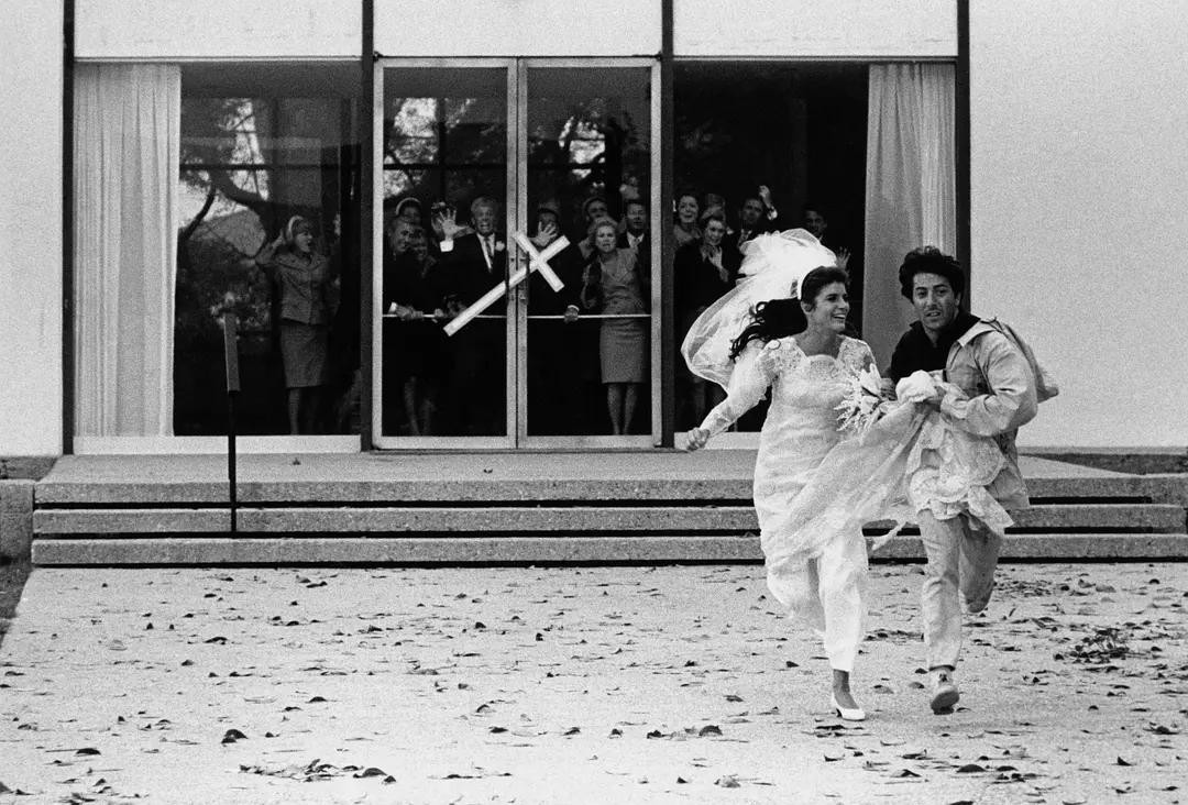 电影中的经典情节,如伊莱恩和本杰明的酒店房间场景和教堂婚礼逃跑的镜头,都呈现了当时性解放和反传统的思潮。