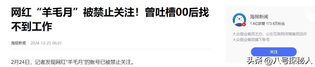 海报新闻——网红“羊毛月”被禁止关注!曾吐槽00后找不到工作