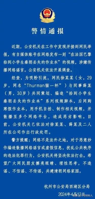 浙江杭州公安介入调查发现,秦朗小朋友丢作业事件,是猫一杯联合同事编撰、炒作,公安机关对徐某某(猫一杯),薛某(秦朗舅舅)及二人所在公司做出行政处罚。