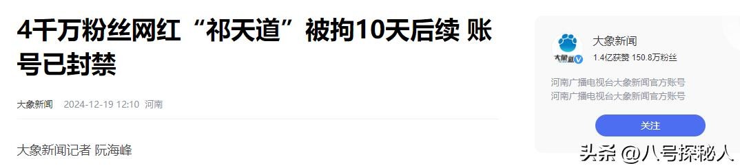 大象新闻——4千万粉丝网红“祁天道”被拘10天后续 账号已封禁