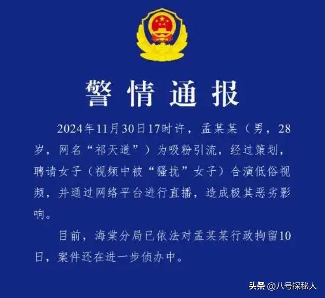 11月30日,警方通告:孟某某(祁天道)为了引流,邀请女子合演低俗视频,通过网络直播造成极其恶劣影响,对孟某某行政拘留10日。
