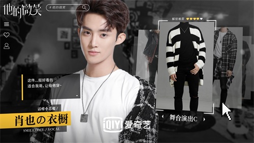 《他的微笑》共设置21个选择节点、17种结局,将剧情选择权交给用户,每一个叉点都可能会触发新的故事走向,5个男生的感情发展由观众选择。陈名豪饰演的肖也和哥哥肖迟都是smile time组合成员,日常有哥哥照顾的肖也性格开朗活泼,正义感十足,但偶尔又是敢想敢为的破坏王。肖也偶然撞见助理千鸟在公司倍受欺负之后,他仗义出手,为千鸟打抱不平,是千鸟身边最贴心的骑士。顺利出道之后,肖也和千鸟的感情线走在最终的十字路口,是有情人终成眷属,还是遗憾分别,尽在观众手中。