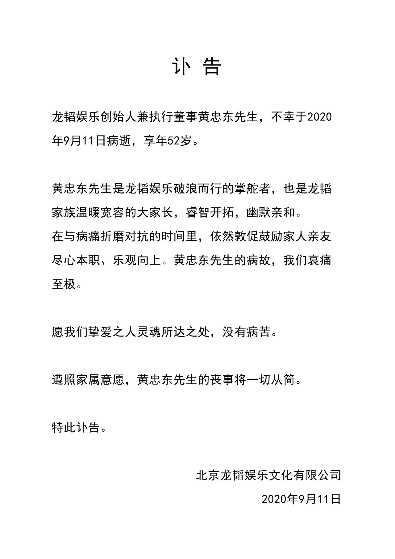 黄子韬的爸爸黄忠东于今日(11日)病逝,享年52岁,由他创办兼任执行董事的“龙韬娱乐”发布讣告,表示黄先生在生病期间,依然敦促鼓励家人亲友尽心本职、乐观向上,而黄子韬工作室也随即转发,代表黄子韬致谢所有关心,并希望大家给予时间处理相关事宜。