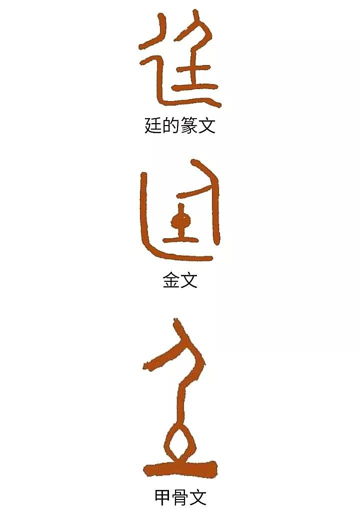 从土的字还有廷。廷就是停,指人走着走着就停下来。朝会仪式严肃,不许随意走动。廷的篆文,左旁借用半边行字,且延伸末笔,绕到下面去。廷字右边,从人从土,人立土上,有停的含义。