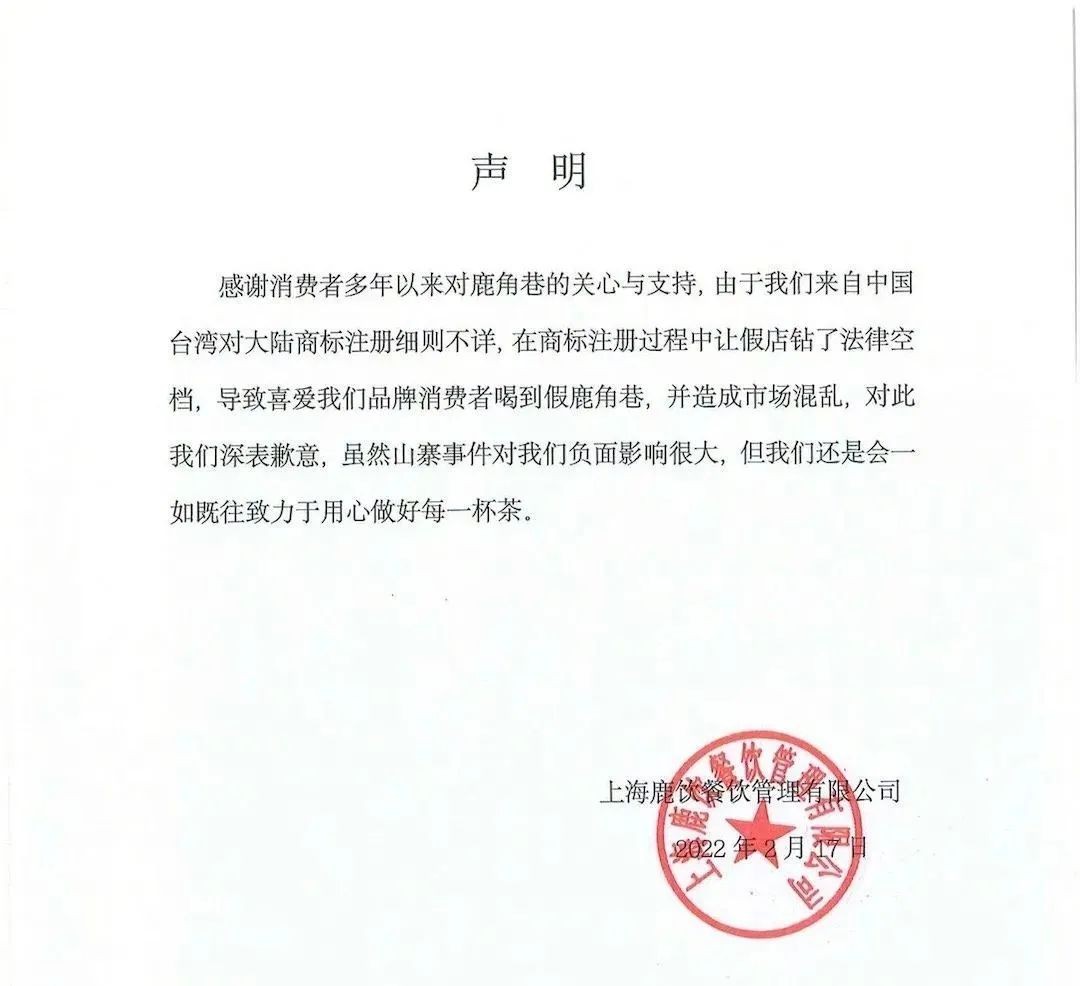 2022年2月17日,位于北京市海淀区凯德精品购物中心的一家鹿角巷店已经停止营业 ↑昨天12:09该奶茶品牌鹿角巷官方微博发布声明由于品牌来自中国台湾,对大陆商标注册细则不详,在商标注册过程中让假店钻了法律空子,导致喜爱我们品牌的消费者喝到假鹿角巷,并造成市场混乱,对此我们深表歉意。