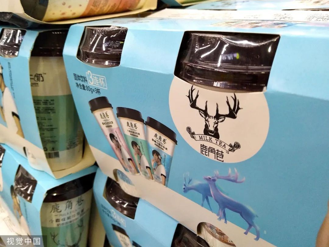 2021年3月12日,江苏宿迁一家超市货架上的鹿角巷奶茶↑