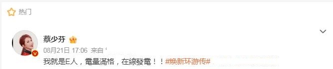 蔡少芬在社交平台发文:“我就是E人,电量满格,在线发电!”