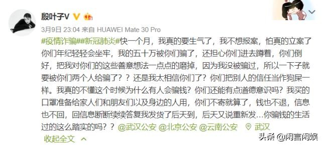 其实明星也是普通人,也会上当受骗,最近殷叶子就被骗了,还被骗了大概五十万!虽然是明星,但是钱都是自己辛辛苦苦挣的,所以让很多网友都心疼她。原来殷叶子是武汉人,最近的武汉不用多说,大家都知道是什么状况。所以在这个特殊时期,最需要的就是口罩,殷叶子本来是想要购买一些口罩自己用,给家人朋友用,结果遇人不淑,被骗了!不得不说现在真的什么人都有,这件事不管发生在谁身上都很气愤,于是殷叶子直接在网上挂出了骗子的身份信息,这一行为也受到了网友们的一致赞同,对待骗子绝不姑息!