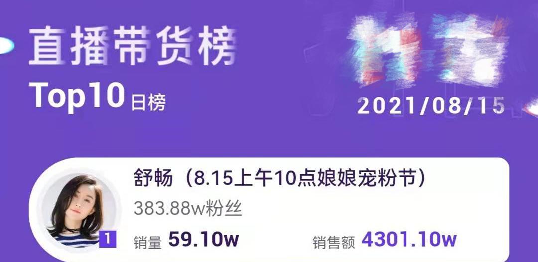 据网络数据显示,舒畅在今年8月15日曾创下过一天4300万元的销售额,虽不知她与平台的具体分成比例是多少,但“日入千万”显然是有的。