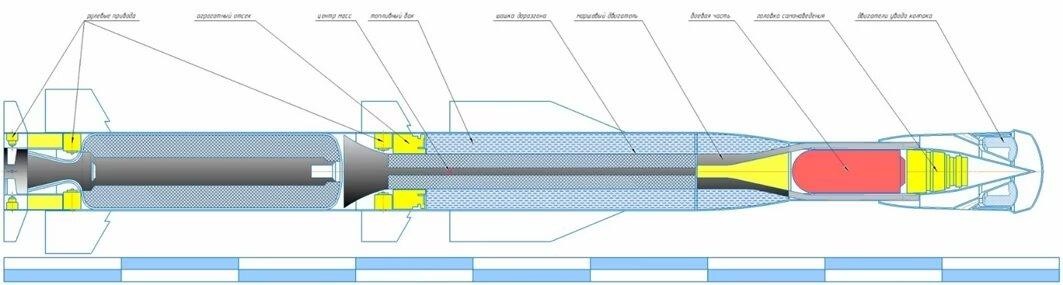 ▲“锆石”高超声速导弹的剖视结构示意图,其动力装置主要由弹体中部的喷气式冲压发动机和弹体后部的固体燃料助推火箭两部分构成(图片来源于:网络)