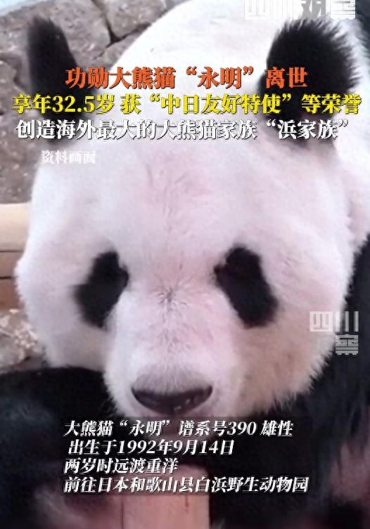 2月14日,成都大熊猫繁育研究基地发文:功勋大熊猫永明离世,享年32.5岁,曾创造海外最大的大熊猫家族“浜家族”,荣获“中日友好特使”等荣誉。
