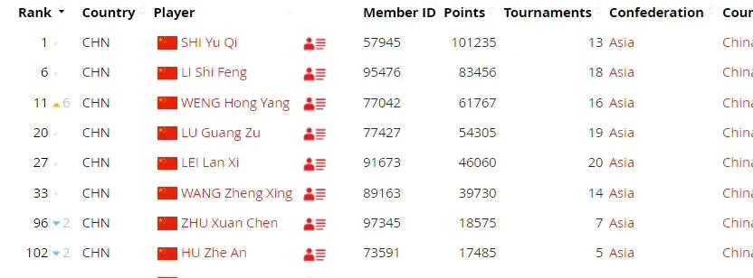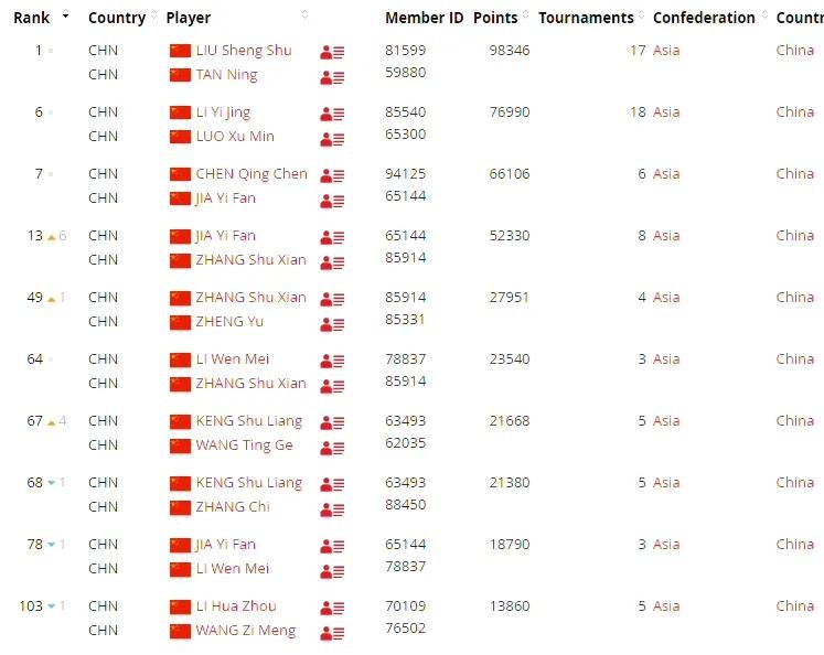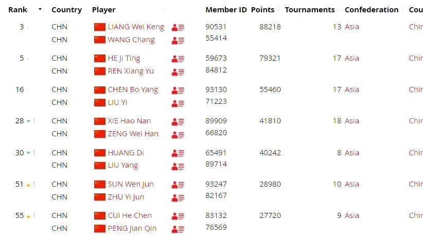 世界羽联公布最新一期世界排名,国羽各单项排名如下:
