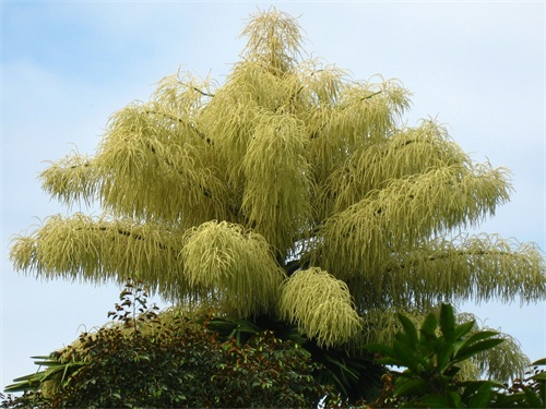三、贝叶棕,原生于印度和斯里兰卡,如今在世界各地都有种植,其高度可达25米,具较密的环状叶痕。贝叶棕具有世界最大的花序,高4~5米,含糖可制糖,亦为绿化观赏植物。
