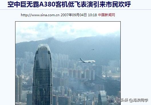 2007年9月2日6时26分,A380飞抵香港,为亚洲航空展揭开序幕。9月3日香港时间早上8时,A380在香港上空低飞表演,并以约1000呎(305米)(低于国金2期)的高度飞过维多利亚港。