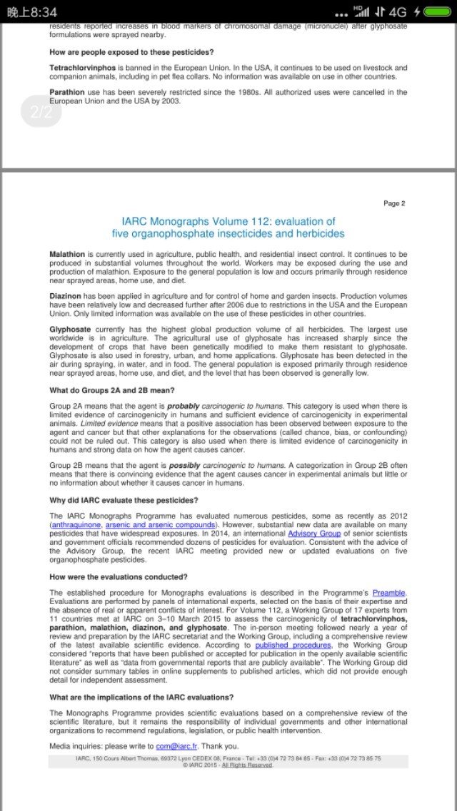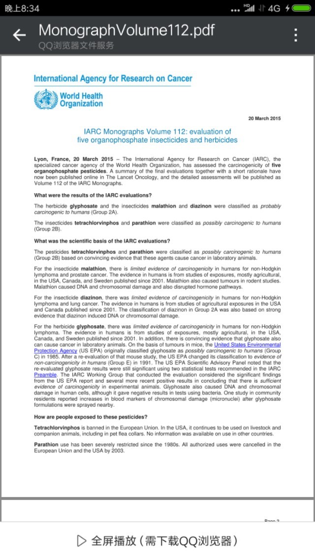 “怀疑探索者”还给出了世界卫生组织(WHO)的研究报告,在报告中不但没有说转基因或者草甘膦有害,恰恰相反,给出的是相反的结论——没有任何证据证明草甘膦致癌。