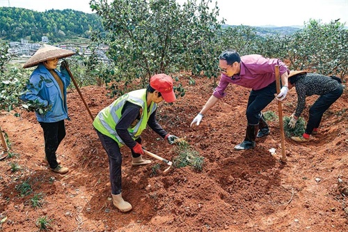 邵阳县塘坪村村民在为油茶林松土、培兜。(刘飞 摄)