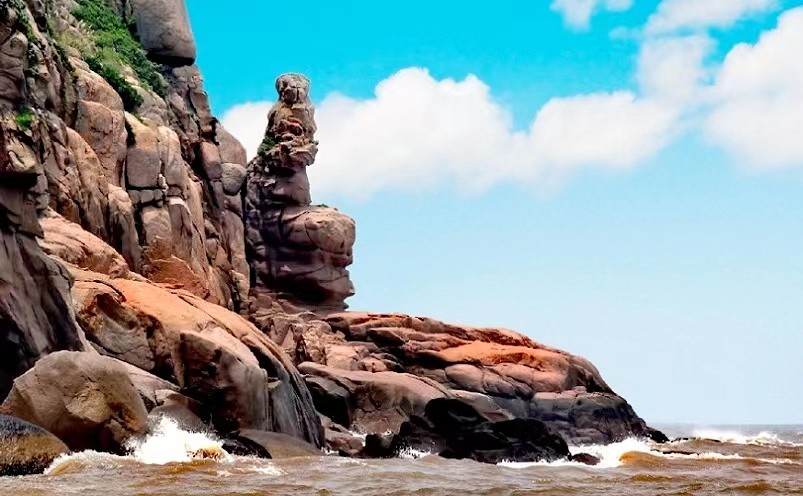 在洞口,一边是城市景观,另外一边呢可以看到各种礁石等海景,危石层叠,险峻多姿,蔚为奇观。听涛、观海、冲浪、赏石,还有沙滩浴,各种页岩、火山岩、摩崖,展现美人床、白龙戏水、红岩龟等,拥有最原汁原味的自然景观。