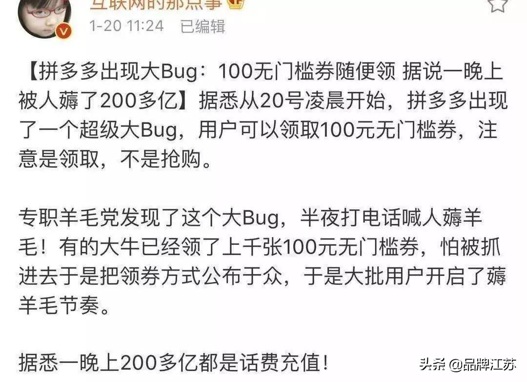 1月20日凌晨,拼多多平台被曝出现系统漏洞,用户可无节制地领取100元无门槛券,因此大批用户借此机会“薅羊毛”,造成史上最大“BUG”惨案。