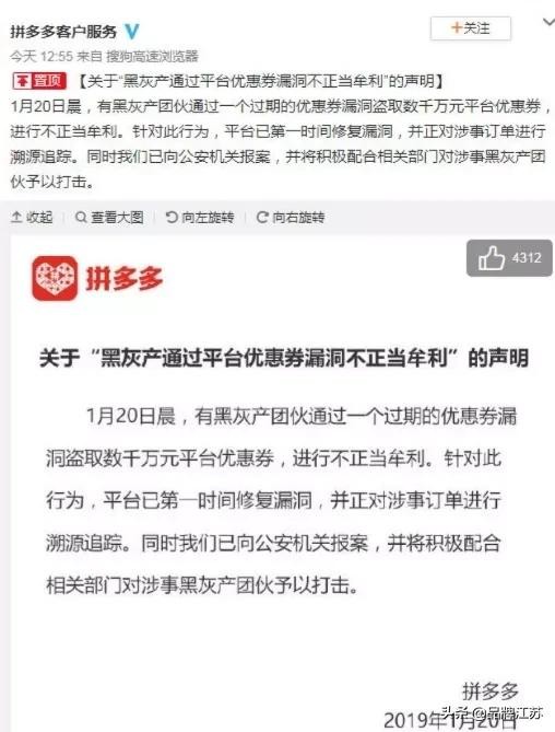 止损完毕后,拼多多发布了一则声明,表示平台已修复漏洞,正在调查相关情况。