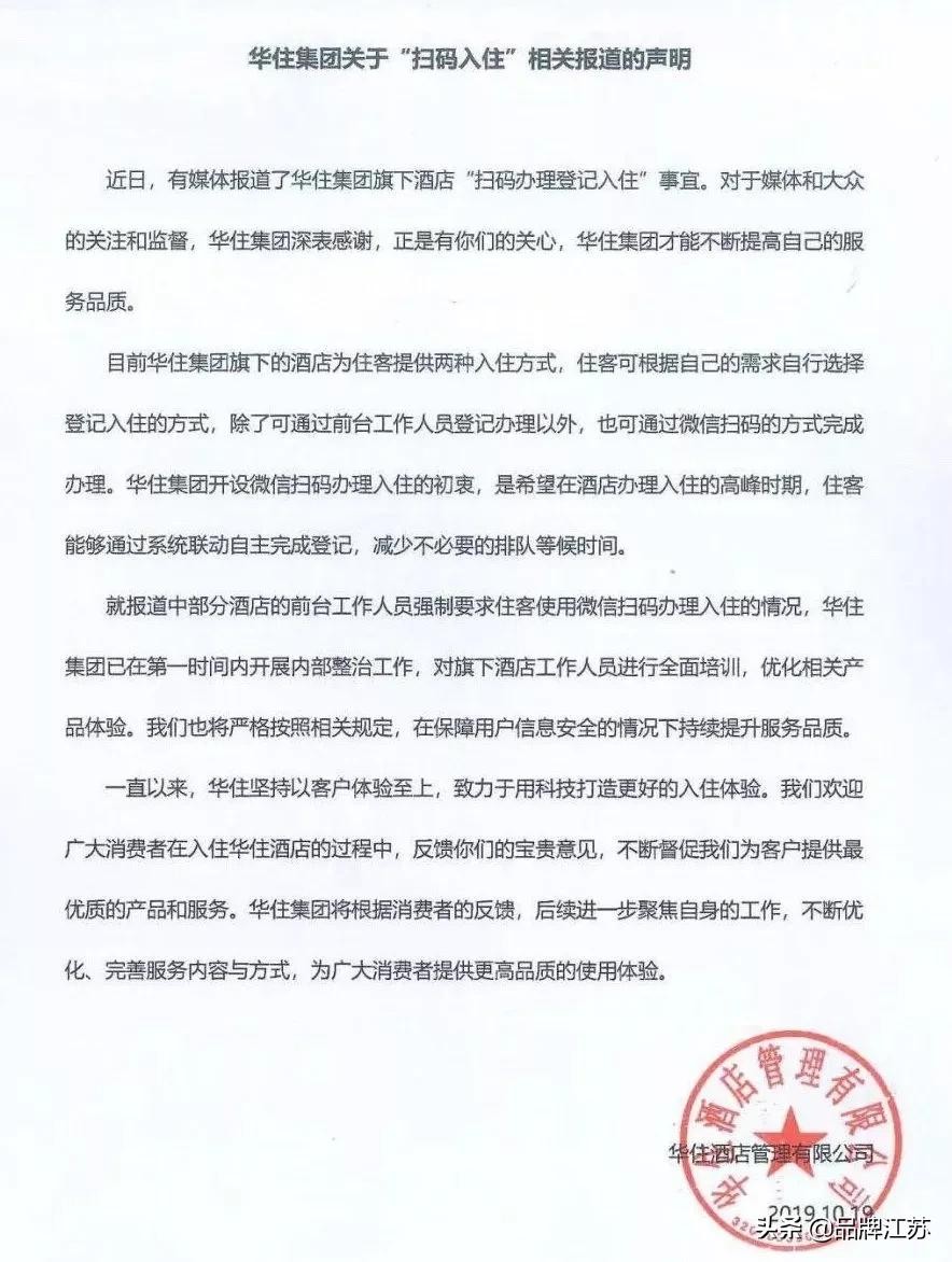 10月19日,华住方面发布相关声明。声明中表示,强制住客扫码入住只是“部分前台工作人员所为”。针对这一现象,华住将开展内部整治工作和培训工作,同时优化信息安全管理,保障住客的信息安全。