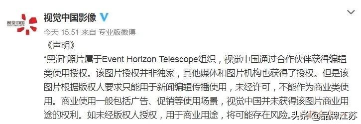 2019年4 月 10 日,全球首张黑洞照片公布,该照片是由事件视界望远镜(EHT)国际合作项目历时 2 年绘制而成的。然而,有网友在视觉中国的图片库发现了这张照片,还明码标价。更有网友扒出,视觉中国的图片库中还有中国国旗、国徽、部分知名企业logo、商标等图片。