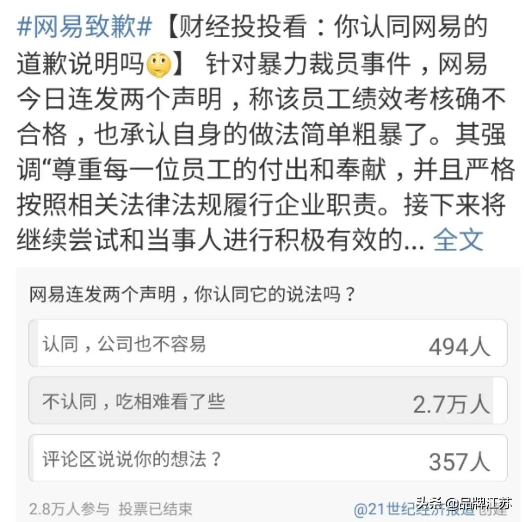 网易前两则声明确实发布得很快,但声明中却强调员工业绩不达标,对其受到的不公平待遇等问题避而不谈。这一波操作让原本就同情弱者的大众对网易产生更为消极、负面的评价。在大众负面情绪全面爆发之后,网易终于公布了让各方满意的处理结果。