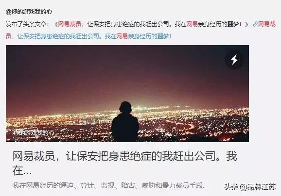 11月24日,一篇名为《网易裁员,让保安把身患绝症的我赶出公司,我在网易亲身经历的噩梦!》的文章在社交网站上迅速流传,网易瞬间陷入道德困境。该文作者控诉了自己在身患绝症之后,在网易受到的种种不公平待遇。