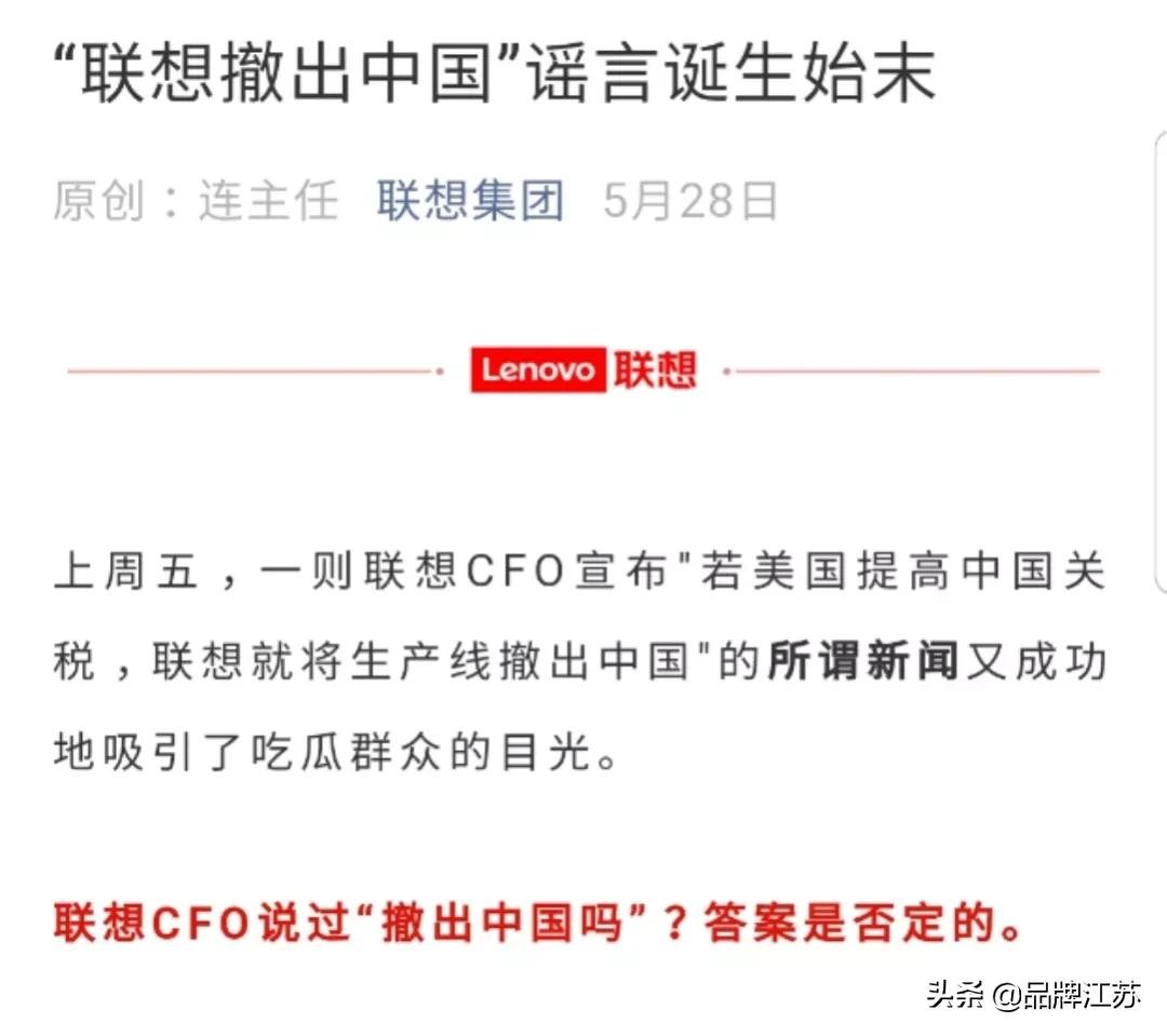 5月28日,在事件发酵5日后,联想官方终于在其微信公众号平台发布了一篇名为《“联想撤出中国”谣言诞生始末》的辟谣文章。该声明的重点是,“联想撤出中国”是有人恶意解读,烦请外界不要再误会联想啦!